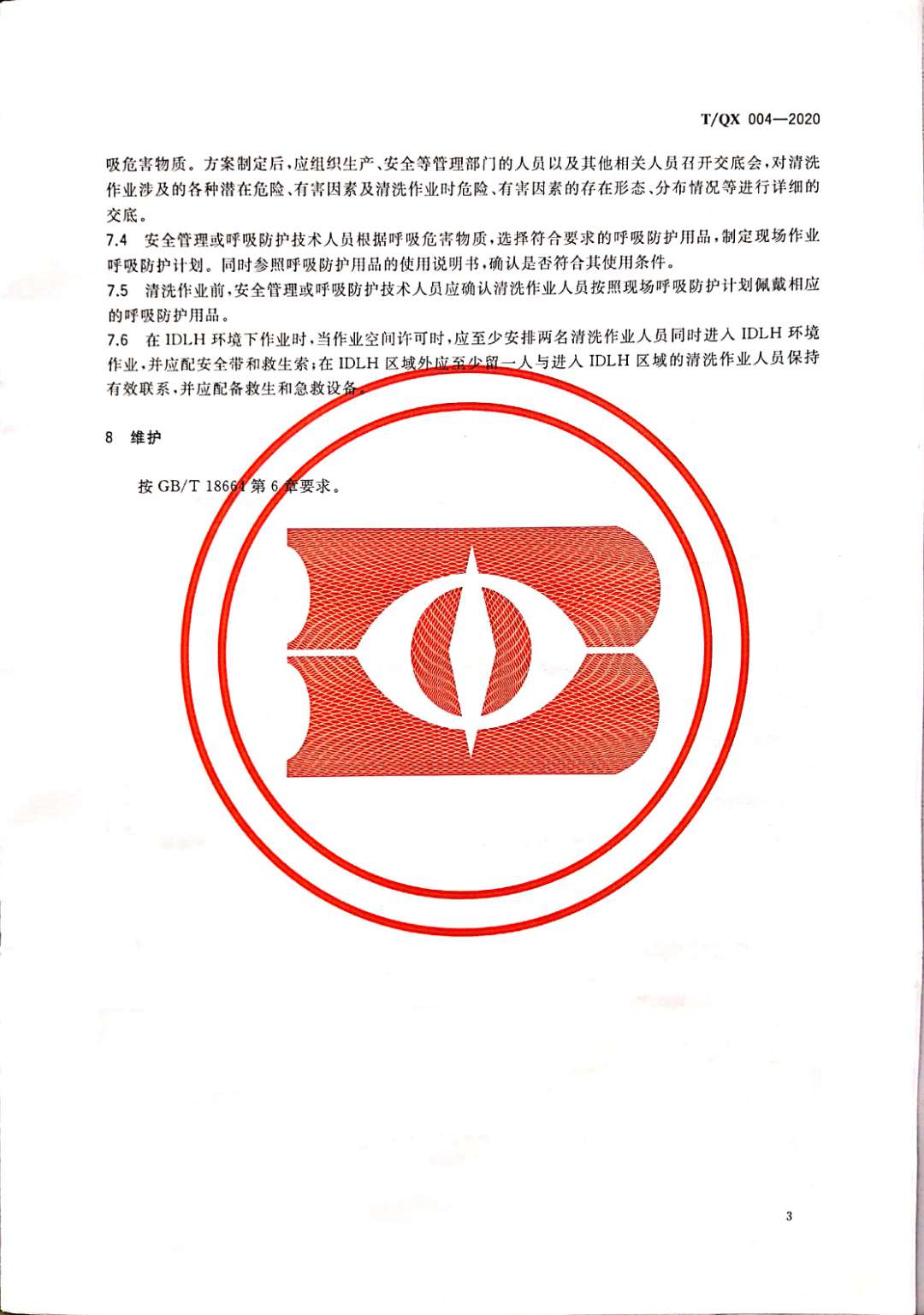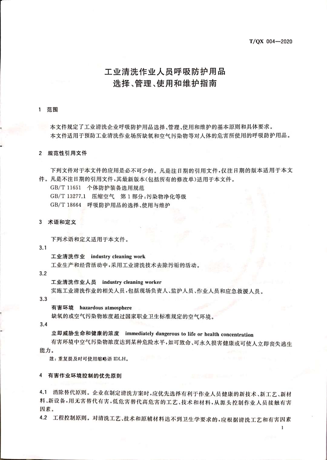 2020年7月公司,我公司起草了中国工业清洗协会关于《工业清先作业人员呼吸防护用品选择、管理、使用与维护指南》的团体标准,该标准适用于防护工业清洗作业场所缺氧和空气污染物等对人体的危害所使用的呼吸防护用品,并对于呼吸防护用品的选择、管理、使用和维护的基本原则与具体要求做出了明确规定。此标准的出台,为整个工业清先行业人员~作业提供了有力的保障。